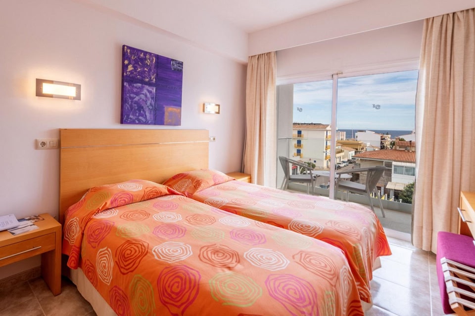 This traditional Mallorcan-style building consists of 4 floors set around an outdoor swimming pool and patio, surrounded by palm trees. The heated, air-conditioned rooms come with work desk and satellite TV.
